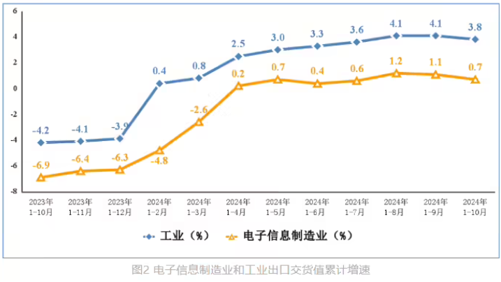 1—10 月,規模以上電子信息制造業累計實現出口交貨值同比增長 0.7%,較 1—9 月回落 0.4 個百分點。10 月份,規模以上電子信息制造業實現出口交貨值同比下降 0.1%。