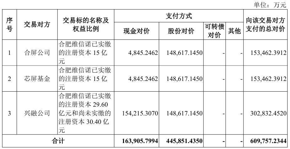 上市公司擬向合屏公司、芯屏基金、興融公司發(fā)行股份及支付現(xiàn)金購(gòu)買其所持有的合肥維信諾40.91%股權(quán),前述股權(quán)對(duì)應(yīng)合屏公司、芯屏基金、興融公司已實(shí)繳的注冊(cè)資本59.60億元及興融公司尚未實(shí)繳的注冊(cè)資本30.40億元。