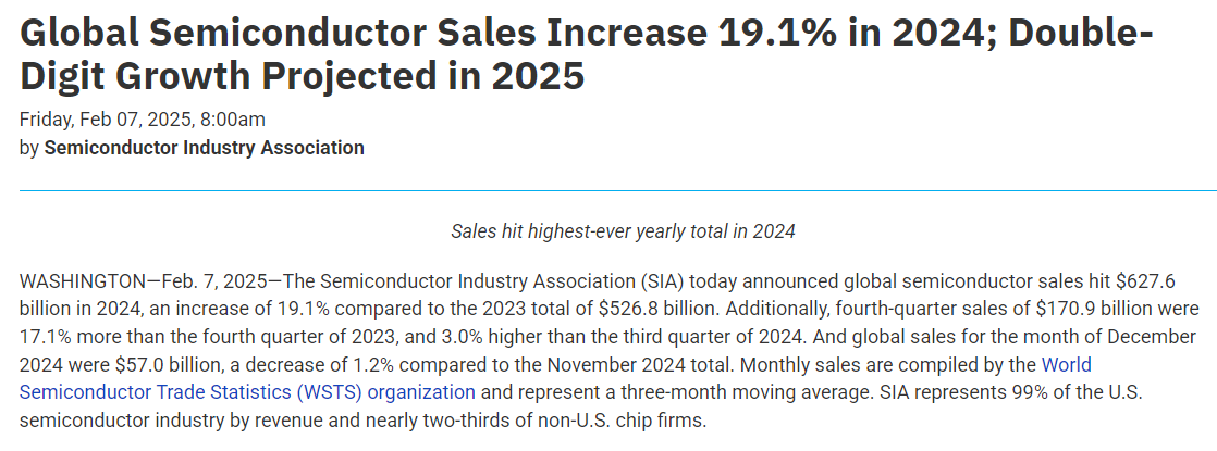 SIA總裁兼首席執行官John Neuffer表示:“2024年,全球半導體市場經歷了有史以來最高的銷售額,年銷售額首次突破6000億美元,預計2025年市場將實現兩位數增長。”