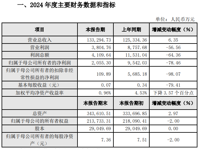2024年度,公司實現營業總收入50,739.99萬元,同比增長5.61%;實現歸屬于母公司所有者的凈利潤842.31萬元,同比減少69.41%;實現歸屬于母公司所有者的扣除非經常性損益的凈利潤-369.21萬元,同比減少117.35%。