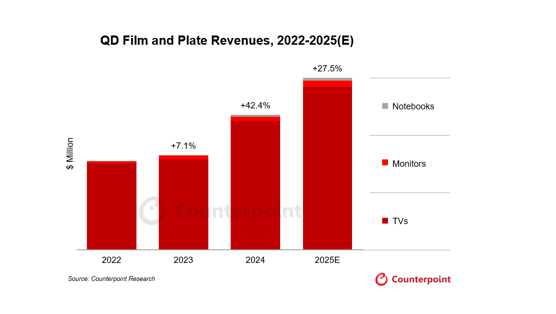 近日,市調機構Counterpoint Research在報告中指出,2024年量子點薄膜和擴散板的收入同比增長42% 。這一增長主要由QD-LCD和MiniLED電視推動。盡管去年筆記本電腦市場規模相對較小,但其收入增長了228%,部分原因是蘋果最終在MacBook Pro中采用了量子點技術。