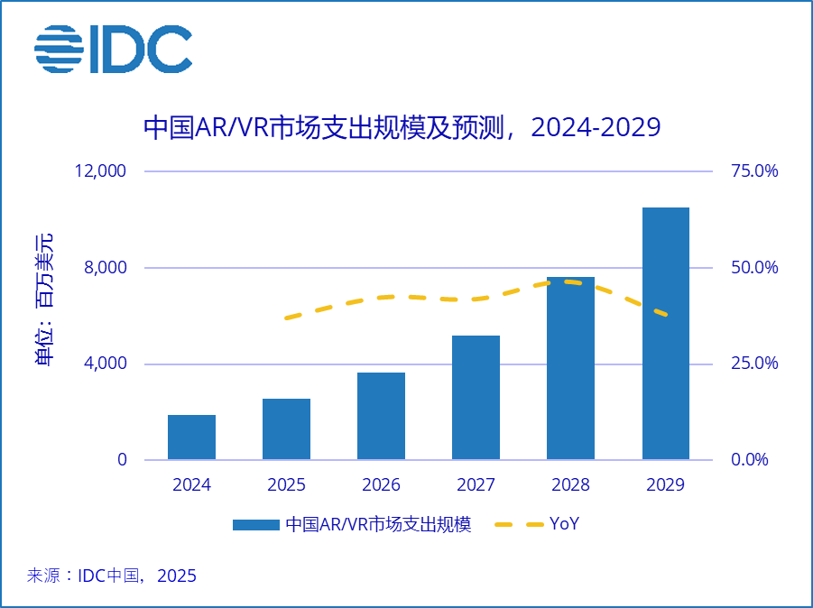 從終端用戶的角度來看,IDC預測,到2029年,消費者市場仍然是AR/VR市場占比最大的領域,五年復合增長率達55.0%。生成式AI技術降低了沉浸式內容創作的門檻,支持個性化虛擬場景,在虛擬社交、娛樂等方面均提升了用戶體驗。同時,在政策利好與AI技術突破的雙引擎驅動下,消費者市場將繼續主導中國AR/VR市場的發展。