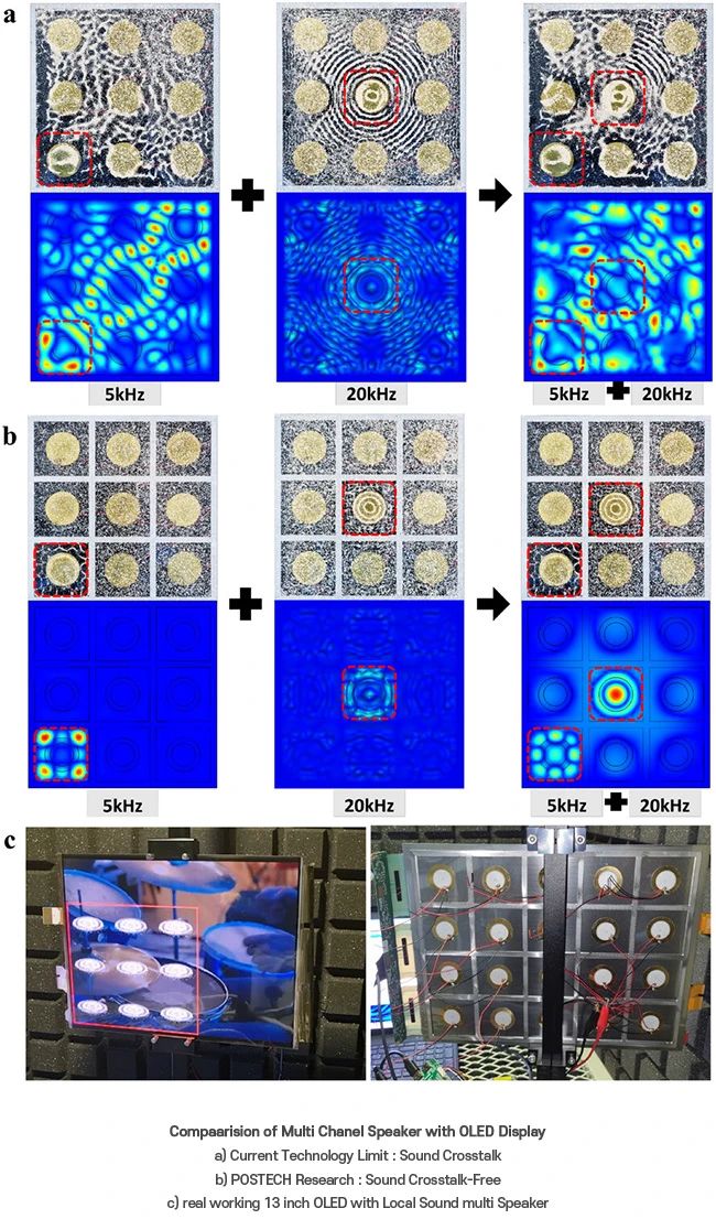 據(jù)韓國(guó)浦項(xiàng)科技大學(xué)官網(wǎng)消息,由該校電氣工程系的Su Seok Choi教授和半導(dǎo)體材料與器件研究生項(xiàng)目的博士生Inpyo Hong領(lǐng)導(dǎo)的研究小組開(kāi)發(fā)了世界上第一種基于像素的本地聲音OLED技術(shù)。這一突破使OLED顯示器的每個(gè)像素能夠同時(shí)發(fā)出不同的聲音,基本上使顯示器能夠作為多通道揚(yáng)聲器陣列。該團(tuán)隊(duì)在13英寸OLED面板上成功演示了該技術(shù),相當(dāng)于筆記本電腦和平板電腦中使用的面板。該研究已被選為頭版研究,并在線發(fā)表在著名的《高級(jí)科學(xué)》雜志上。
