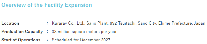 通過此次擴建,Kuraray公司相關年產能將從目前的2.96億平方米增加到3.34億平方米。
