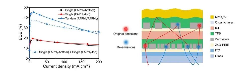 針對這一世界性難題,團隊通過優化連接層結構,實現了疊層器件中高效的電荷注入與平衡。更為重要的是,通過調控鈣鈦礦發光層的微納結構,創新性地提出利用疊層器件中獨特的層間光子循環效應的策略,即一個發光單元產生的光子可被另一鈣鈦礦層重新吸收并再次發射,從而突破了傳統光提取效率的限制。該策略使疊層鈣鈦礦LED器件效率超越了單結器件效率的簡單疊加,實現了“1+1>2”的效果,所制備的LED器件外量子效率達到45.5%,在100 mA cm-2電流密度下仍保持34.5%的高效率,再次創造了鈣鈦礦LED發光效率的世界紀錄。