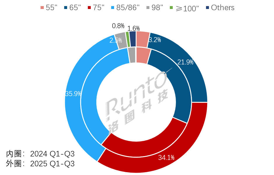 86寸、75寸、65寸三大主流尺寸的統(tǒng)治力依然穩(wěn)固,前三季度的累計出貨量份額合計達90.5%。其中,75寸的需求增長最為顯著,份額同比增長了4.5個百分點至34.1%;尤其在第三季度,其單季份額飆升至39.9%,也由此拉低了全年平均尺寸。該尺寸段產(chǎn)品主要由BOE和CSOT供貨,比例大致為65:35。