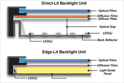 LED背照燈按配置的位置分為“邊緣發(fā)光型”(也稱為側光式)和“直下型”(也稱為矩陣式)。不過,二者實現的性能各有優(yōu)缺點。邊緣發(fā)光型LED背光具有成本低、超薄、低功耗的特性,目前市面上主流的LED顯示器均基于此技術。