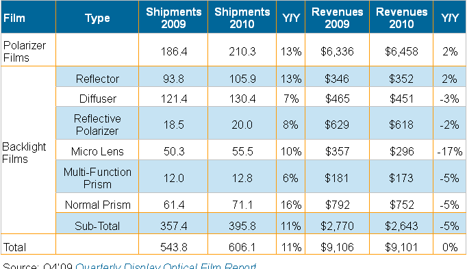DisplaySearch上海辦公室,2010年1月13日 --- 根據DisplaySearch在光學膜領域調研指出,2009年全球TFT LCD用光學膜出貨面積估計達到5億4千3百萬平方米,同時預估2010年光學膜出貨將持續增長到6億零6百萬平方米,年成長率將達11%。不過由于平均銷售價格不斷下滑,我們估計2010年出貨金額將與今年持平在91億美元水平。另一方面隨著綠色顯示器需求與LED背光市場增長驅動新一波背光設計發展,使得如棱鏡片(prism films)、反射式偏光片(reflective polarizers)或者micro-lens films等產品的需求也跟著提高;對于能持續提高技術能力的廠商提供較佳市場機會。