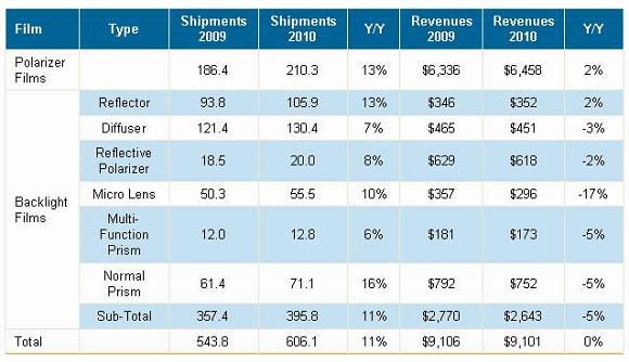 DisplaySearch指出,2009年全球TFT LCD用光學膜出貨面積估計達到5.43百萬平方公尺,預計2010年光學膜出貨將持續增長到6億零6百萬平方公尺,年成長率將達11%。不過由于平均銷售價格不斷下滑,估計2010年出貨金額將于今年持平在91億美元水準。