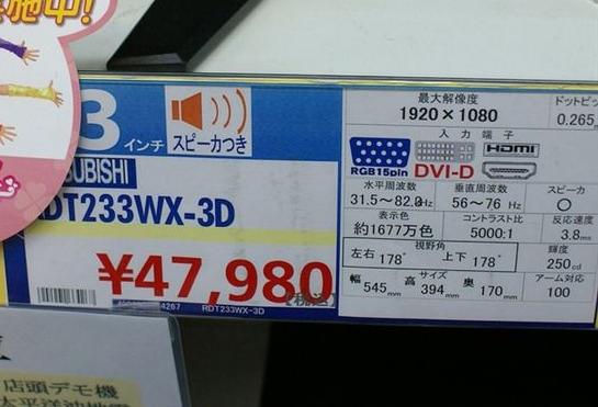 近日,三菱制造的支持3D顯示的液晶顯示器在日本秋葉原正式發售,型號為RDT233WS-3D(BK)。