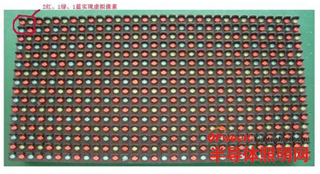 顯示單元中每一點的紅、綠、藍顯示組成部分均勻分布,以配合像素的混色效果;虛顯示點的表征顏色由相鄰的紅、綠、藍像素混色構成。 虛擬像素的點是分散的,實像素的點是凝聚的。虛擬像素的發光點在燈管間,實像素的發光點在燈管上。