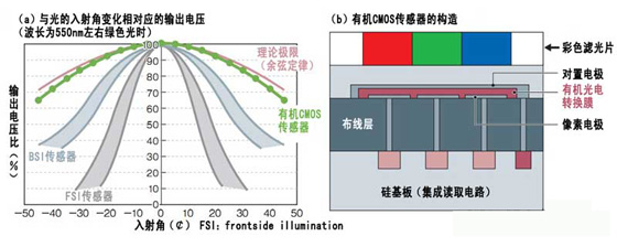 富士膠片針對正在開發之中的使用有機光電轉換薄膜的CMOS傳感器(有機CMOS傳感器),發表了大幅遏制光線入射角變化造成的感度下降的成果(圖1)。