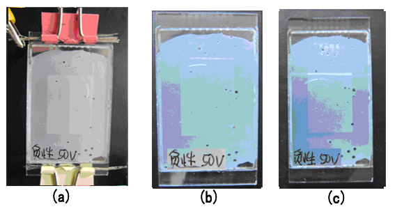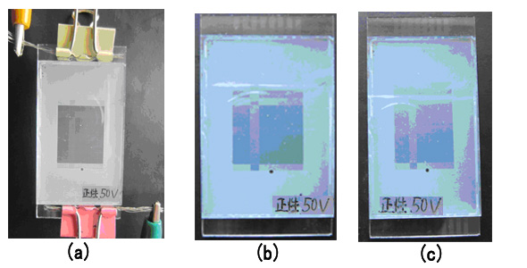 圖4 50V電壓誘導負性PDLC照片,(a)加電壓,(b)無電壓,(c)放置60天后