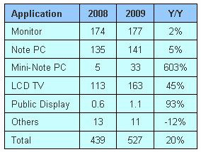 雖然液晶顯示器對大尺寸液晶面板而言是一個較成熟的市場,2009年出貨量相較2008年成長2%,而與2007年相同。筆記型計算機與迷你筆電用面板合計出貨達一億7,500萬片,2009年年成長率約25% (如下表)。電視面板表現(xiàn)最為亮眼,出貨量成長45%,達1億6,300萬片。另外,公眾顯示器面板出貨成長93%,從90萬片成長到110萬片。