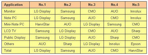 以2009年大尺寸液晶面板出貨片數(shù)排名來看,LGD以市占率24.9%居冠,而三星(Samsung)以24.5%相當接近的比例排名第二。友達(AUO)市占率為17%,奇美(CMO)市占率為14.2%。以出貨面積與出貨金額來看,則是由Samsung居冠。韓國制造商大大增加出貨面積的比重,從2008年的46.2%,成長到2009年的52.8%。